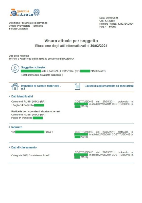 NB. Durante la ricerca sul soggetto può capitare che, per imprecisione nella registrazione da parte del Catasto, un nominativo venga trascritto con diverse denominazioni, costringendo all'apertura di più Visure pur facenti capo allo stesso codice fiscale. In questo caso il nostro Staff ti chiederà un costo di Euro 5,00 (Iva Inclusa) a nominativo.